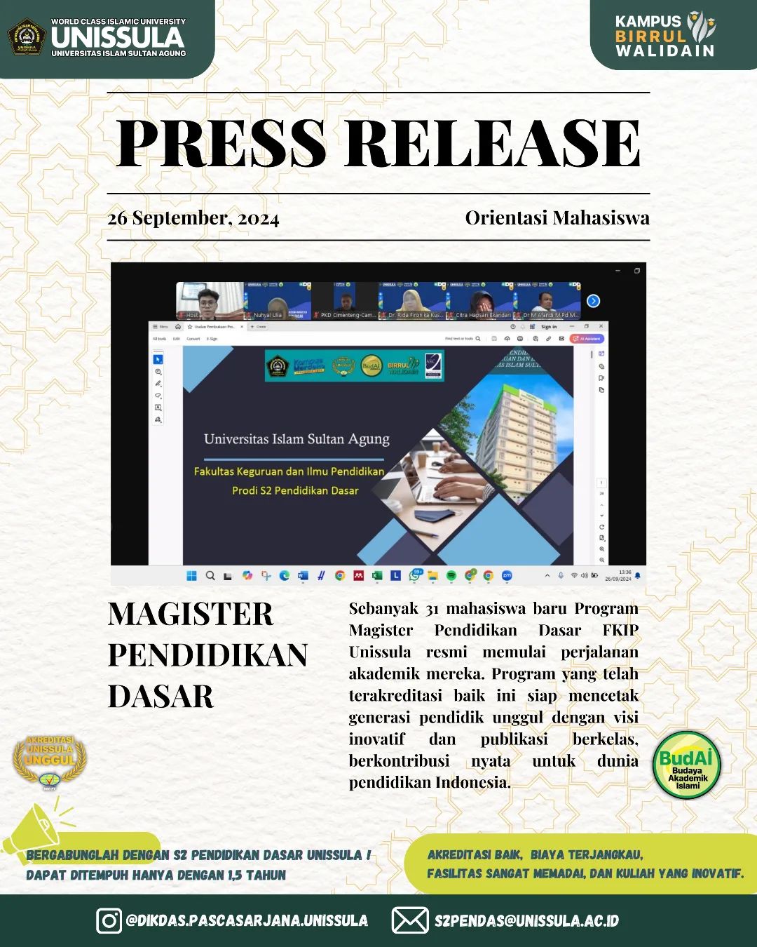 Read MoreSemarang, 26 September 2024 sebanyak 31 mahasiswa baru mengikuti orientasi Program Magister Pendidikan Dasar di FKIP Unissula. Dekan mengungkapkan harapannya agar mahasiswa S2 dapat menghasilkan publikasi dan memiliki Hak Kekayaan Intelektual (HKI) sebagai output selama perkuliahan. Sementara itu, Kaprodi S2 Pendidikan Dasar menambahkan bahwa meskipun baru berdiri, program ini sudah terakreditasi dengan baik oleh LAMDIK.…