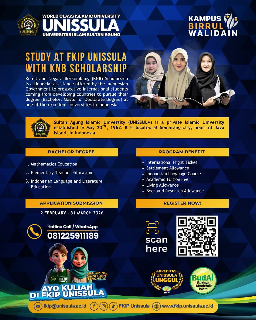 Read MoreHello, future leaders! FKIP UNISSULA is opening its doors wide for international students through the Kemitraan Negara Berkembang (KNB) Scholarship. Seize the opportunity to pursue Bachelor, Master, or Doctoral degrees at the best private Islamic university located in Semarang. đź—“ Save the Date:February 2 – March 31, 2026. Don’t miss this golden chance to grow…